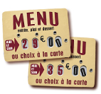 Les menus midi et soir : Deux menus à 29 € et 35 € tout compris, à savourer midi et soir... avec toujours l'ensemble des entrées et des plats à retrouver et choisir à la carte. |