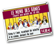 Le Menu des Gones : (sauf samedi) Un menu réservé au moins de 10 ans. Un menu équilibré pensé pour eux : un sirop à l'eau, une escalope de volaille accompagnée des légumes du jour et pour finir dans la douceur, un dessert du jour. Le tout pour 17 € ... avec toujours à disposition feuilles et crayons de couleur pour que chacun puisse prendre son temps. |